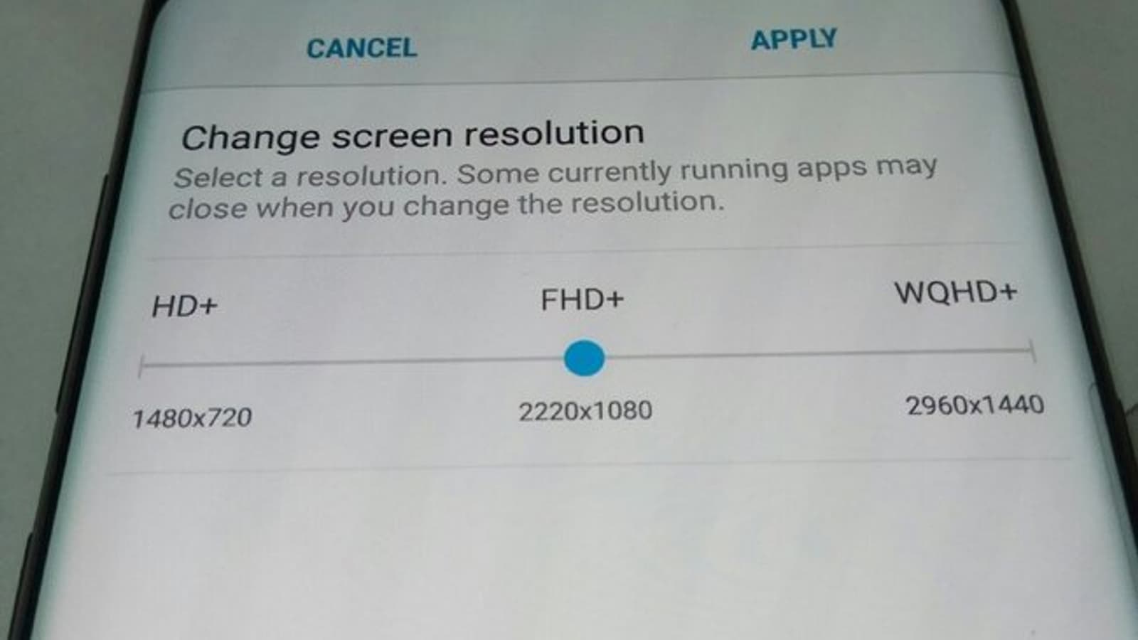 В Сети продолжают появляться новые фотографии смартфона Samsung Galaxy S8. В этот раз вашему вниманию представлено изображение, на котором показан раздел меню, позволяющий менять разрешение дисплея.