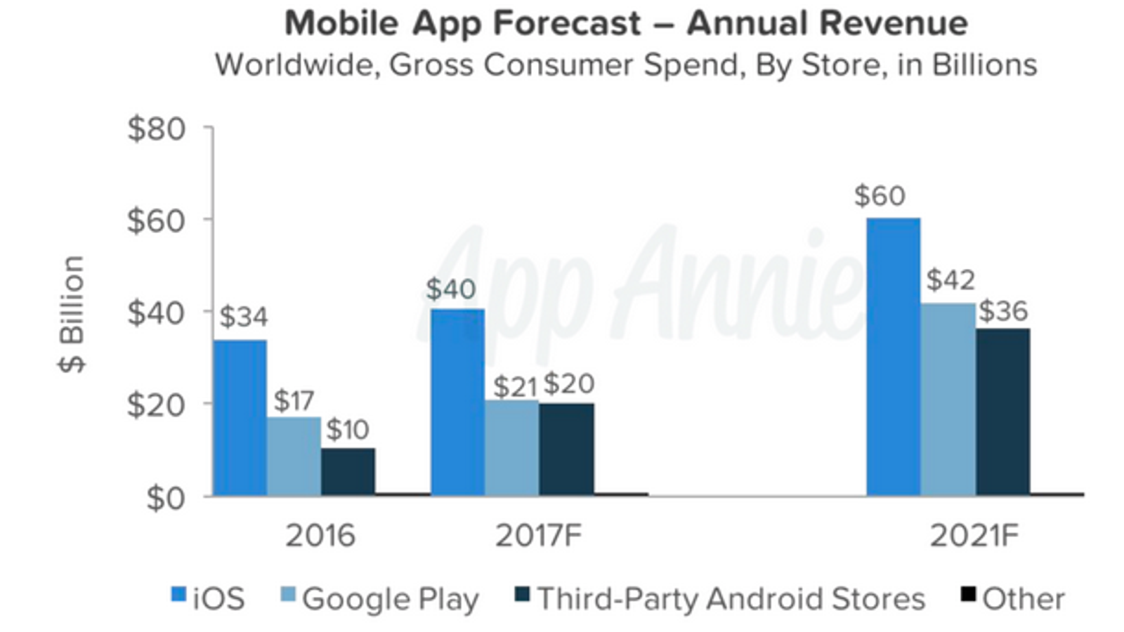 По мнению специалистов, App Store продолжит опережать Google Play в ближайшие несколько лет (прогноз делался до 2021 года). Однако в этом году приложения Android впервые опередят iOS по объему дохода, если учитывать суммарные продажи Google Play и сторонних магазинов приложений для Android, которые поддерживаются Tencent, Baidu, Xiaomi, Huawei и другими компаниями.