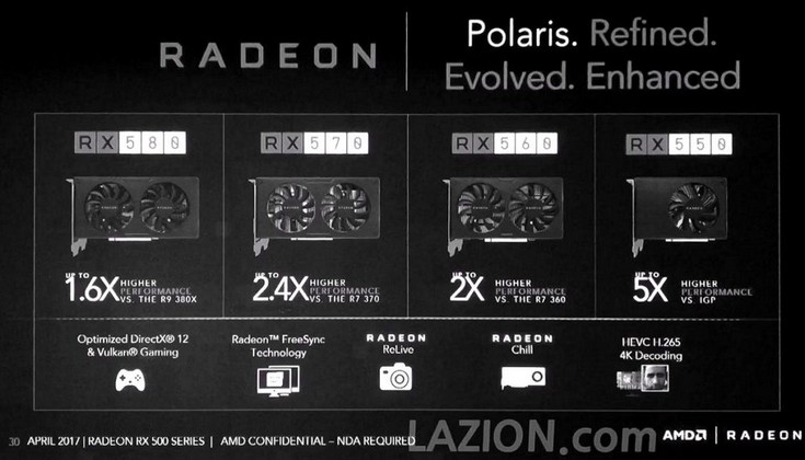 Модельный ряд пополнят Radeon RX 580, RX 570, RX 560 и RX 550. При этом полноценно новой картой из них можно считать лишь последнюю, тогда как остальные являются переименованными версиями существующих адаптеров Radeon RX 400.