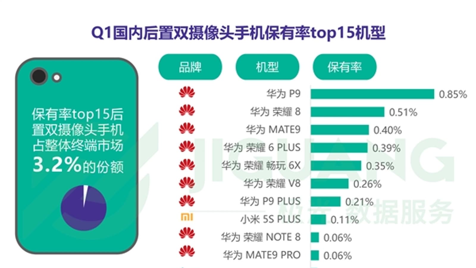Оказывается, в Китае 3,2% всех смартфонов, проданных в первом квартале текущего года, имели сдвоенную камеру. Более того, львиная доля таких аппаратов была произведена компанией Huawei. На диаграмме ниже можно видеть, какие именно модели какую часть рынка заняли.