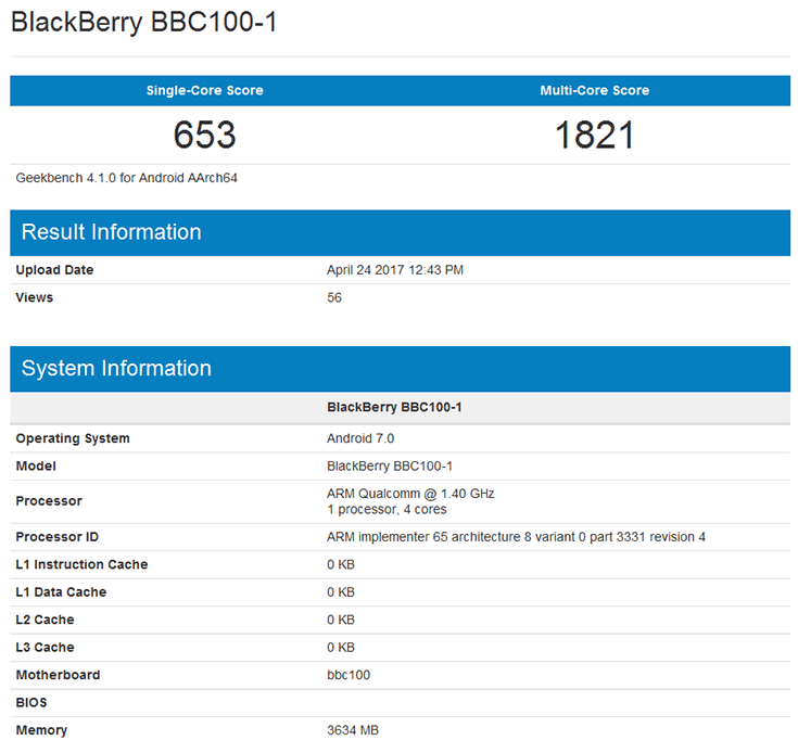 Смартфон BlackBerry Aurora (BBC100-1), представленный в марте, замечен в базе данных теста Geekbench.