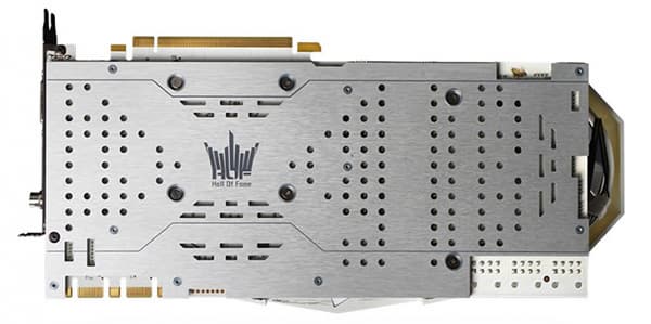 Система охлаждения с тремя вентиляторами под стать: из-за нее видеокарта занимает в корпусе ПК пространство трех слотов. Разумеется, не обошлось без теплораспределительной пластины из анодированного алюминия, крепящейся к оборотной стороне платы, а для подачи дополнительного питания предусмотрено целых три восьмиштырьковых разъема (вместо одного восьми- и одного шеститырькового, имеющихся по умолчанию). Подсистема питания KFA2 GeForce GTX 1080 Ti HOF 8 Pack Edition построена по схеме «12+3 фазы».