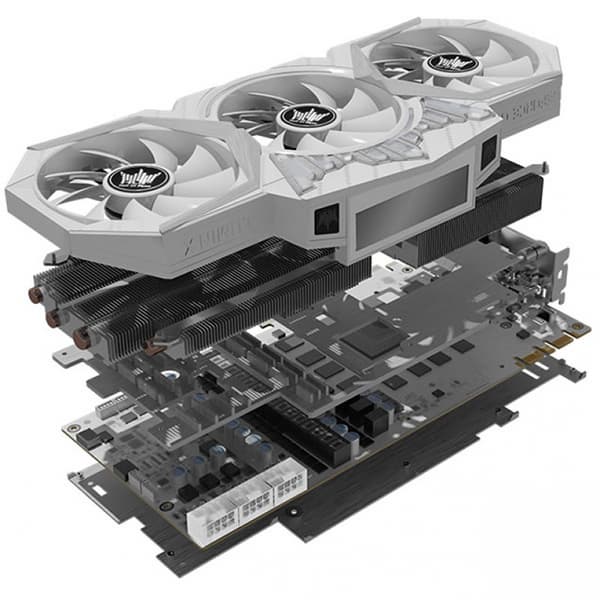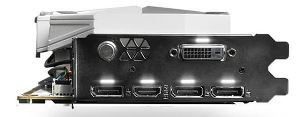 На боковой стороне разработчики разместили экран, на который выводятся текущие значения частоты GPU и памяти, а также температура видеоядра. Имеется и настраиваемая подсветка RGB. Набор видеовыходов представлен тремя DisplayPort 1.4, одним HDMI 2.0b и одним DVI.