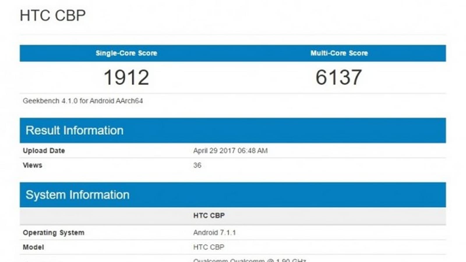 В базе данных тестового пакета GeekBench был протестирован смартфон под названием HTC CBP, который, вероятнее всего, будет представлен под названием HTC U 11.