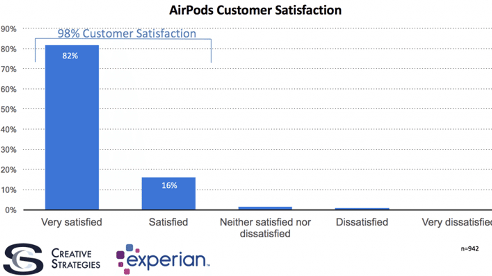 Источник провел исследование, целью которого было определение степени удовлетворенности пользователей Apple AirPods этими наушниками. Как оказалось, наушники Apple AirPods удовлетворяют 98% участников опроса, причем 82% опрошенных «очень довольны».
