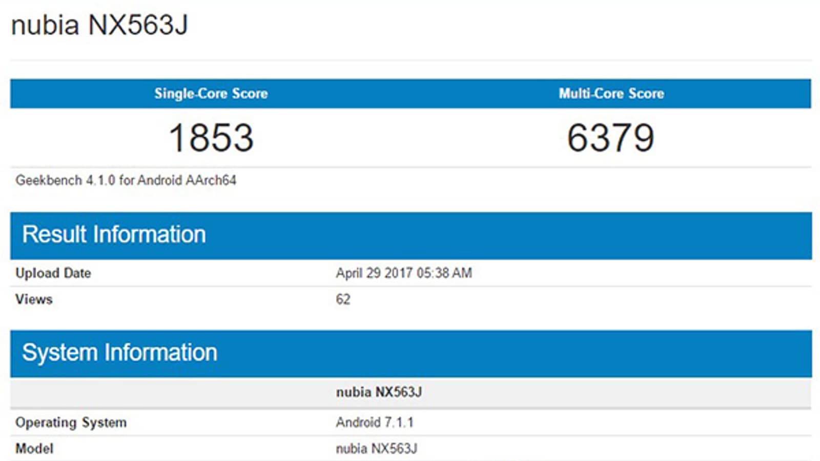 В базе данных бенчмарка Geekbench засветился еще не представленный официально смартфон Nubia NX569J китайской компании ZTE. Новинка привлекает внимание своей платформой – флагманской Qualcomm Snapdragon 835 (MSM8998). Сообразно производительности этой SoC выглядят и результаты тестов бенчмарка: 1853 балла в однопоточном, 6379 баллов в многопоточном.