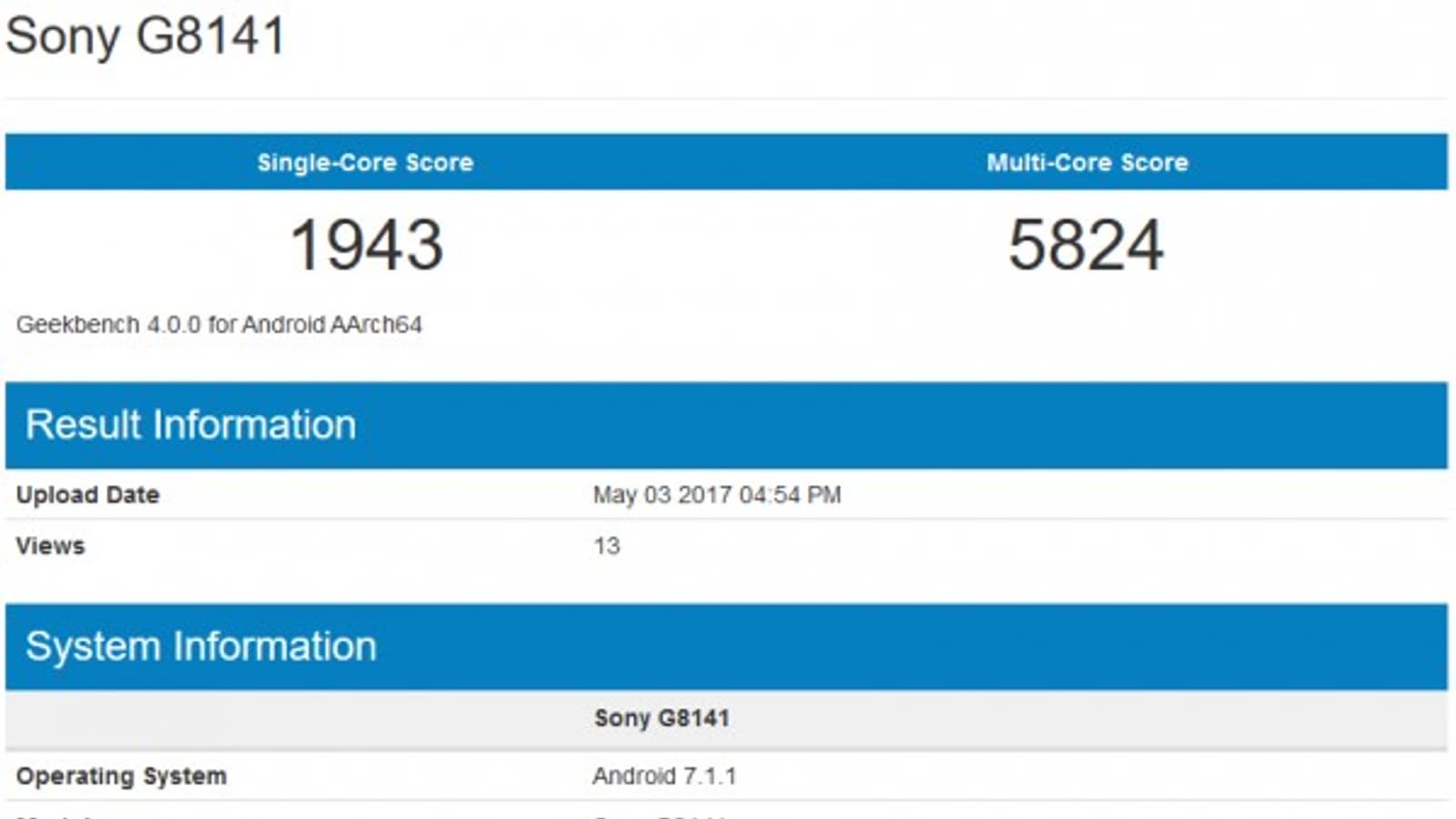 Теперь же устройство было протестировано при помощи ПО Geekbench под модельным номером Sony G8141. Смартфон работает под управлением Android 7.1.1, оснащен Snapdragon 835 и 4 ГБ ОЗУ.