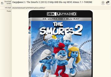 Торрент ссылается на файл с мультфильмом Smurfs 2 в разрешении 2160p, сжатый кодеком HEVC