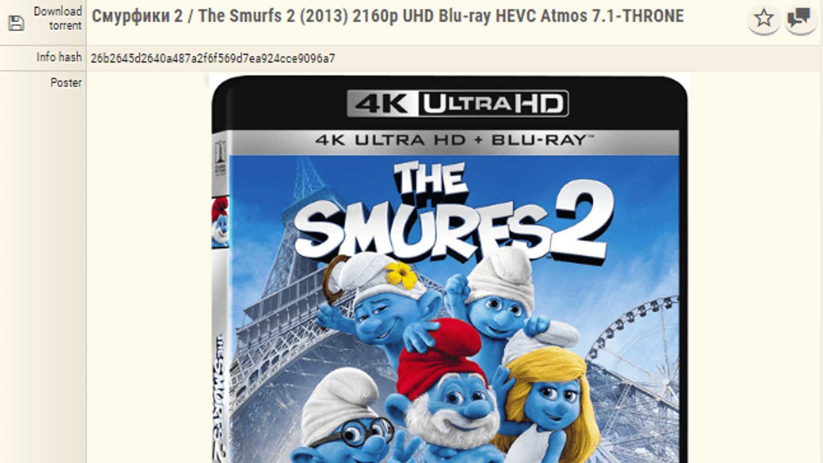 Торрент ссылается на файл с мультфильмом Smurfs 2 в разрешении 2160p, сжатый кодеком HEVC. Размер файла — 53,30 ГБ.