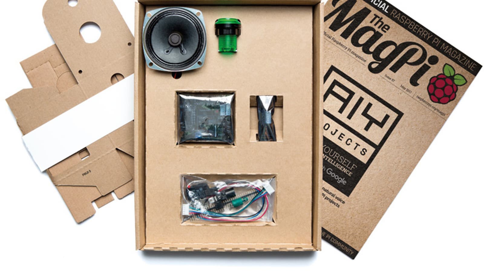 В набор входит плата расширения Google Voice Hardware Attached on Top (HAT), плата со стереофоническим микрофоном, кнопка, громкоговоритель, разъемы и провода. Кроме того, в наборе есть картонный складной корпус.