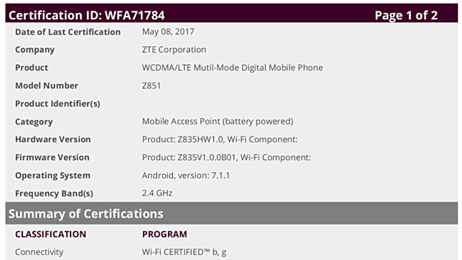 Источник обнаружил в базе данных устройств, сертифицированных организацией WiFi Alliance (WFA), новый смартфон ZTE. Устройство носит индекс модели Z851.