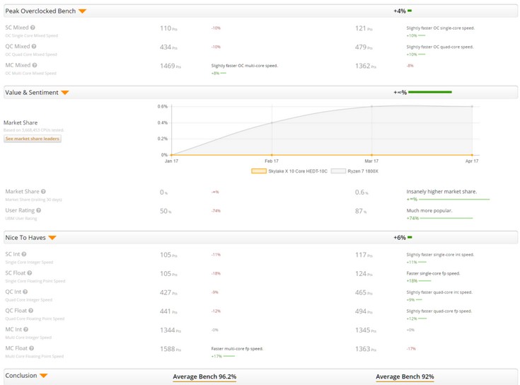 Во-первых, отметим, что младший CPU в линейке Kaby Lake-X относится к семейству Core i7, а не Core i5, как считалось ранее, несмотря на отсутствие поддержки Hyper-Threading. Во-вторых, в Сети даже есть результаты тестирования старших моделей Skylake-X. Сравнение с Ryzen можно увидеть на скриншотах ниже.