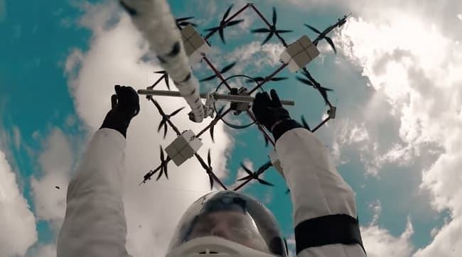 В прошлом году дроны Aerones уже становились героями видеороликов в YouTube, в которых они тянули за собой по снегу и воде людей на досках. Теперь же БПЛА Aerones поднял на высоту 330 м человека, который совершил первый в истории прыжок с парашютом с дрона.