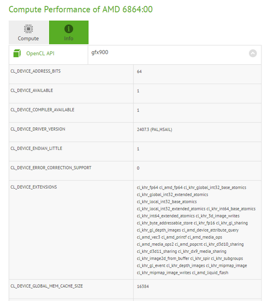 ПО не предоставляет большого количества полезной информации, но кое-что узнать можно. К примеру, частота GPU определяется равной 1600 МГц. Даже если тест проходила разогнанная видеокарта, это свидетельствует о повышенном относительно карт Polaris частотном потенциале. Кроме того, данный ускоритель располагал 64 вычислительными блоками, что соответствует 4096 потоковым процессорам и соотносится с ранними данными. Это должна быть самая старшая карта в семействе Vega. Также видеокарта оснащалась 16 ГБ памяти.