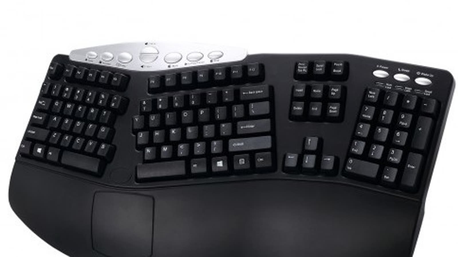 Удобное положение рук обеспечивается изогнутой формой клавиатуры и разделением основного блока клавиш. Для снижения нагрузки также служит встроенный упор для кистей рук.