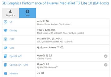 10-дюймовый планшет Huawei MediaPad T3 Lite засветился в базе данных GFXBench