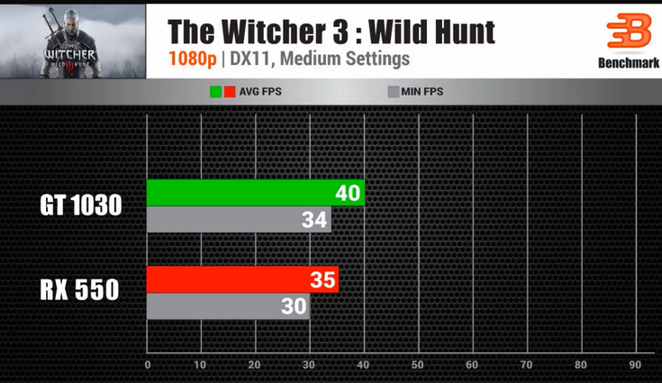 Тут уже разница более существенна, причём не в пользу карты AMD. В большинстве игр GT 1030 обходит противника, причём порой достаточно существенно.