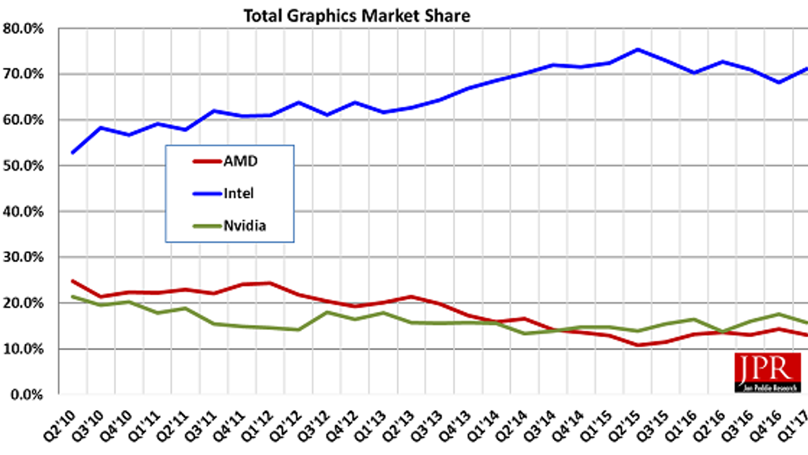 Специалисты аналитической компании Jon Peddie Research (JPR) подвели итоги первого квартала 2017 года на рынке GPU. По их подсчетам, указанный рынок сократился по сравнению с предшествующим кварталом на 17,5%. Это существенно больше среднего показателя, равного 6%. Сезонное сокращение сказалось на всех участниках рынка. Компания AMD сократила поставки на 25%, Nvidia — на 26%, Intel — на 14%.