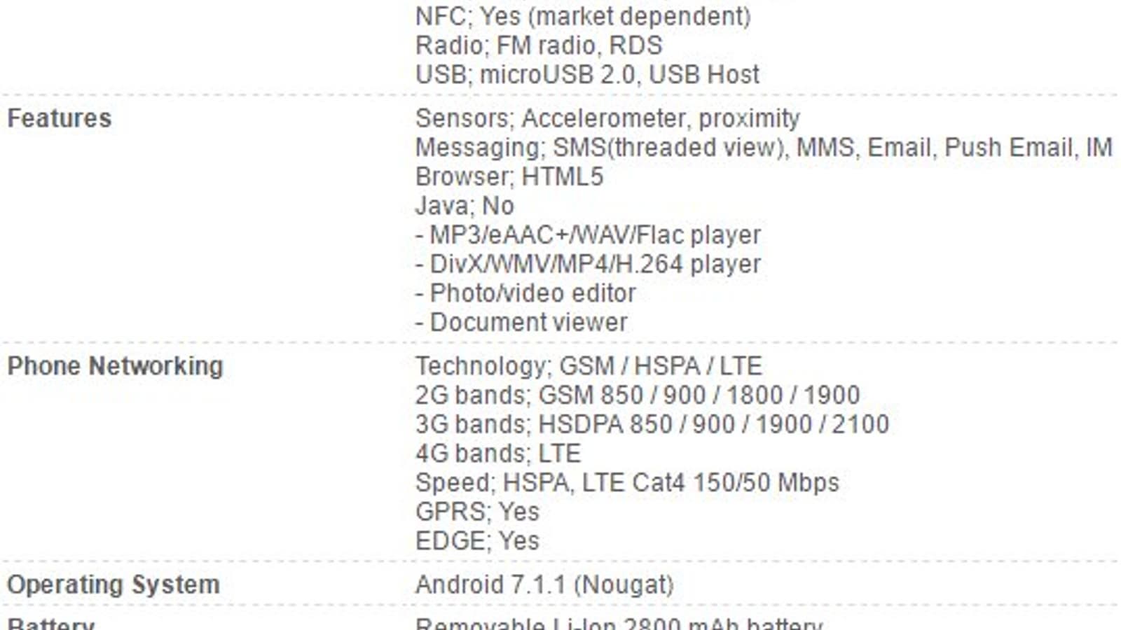 Смартфон оснащен аккумулятором емкостью 2800 мА•ч, он работает под управлением операционной системы Android 7.1.1. Камеры имеют разрешение 8 и 5 Мп. Версии для некоторых рынков получат модуль NFC.