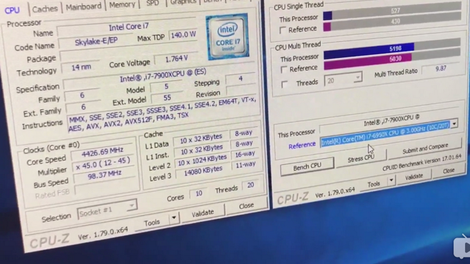 Итак, в тесте CPU-Z новинка набрала 527 баллов в однопоточном режиме и 5198 баллов в многопоточном. Core i7-6950X при этом набрал 430 и 5030 баллов соответственно.