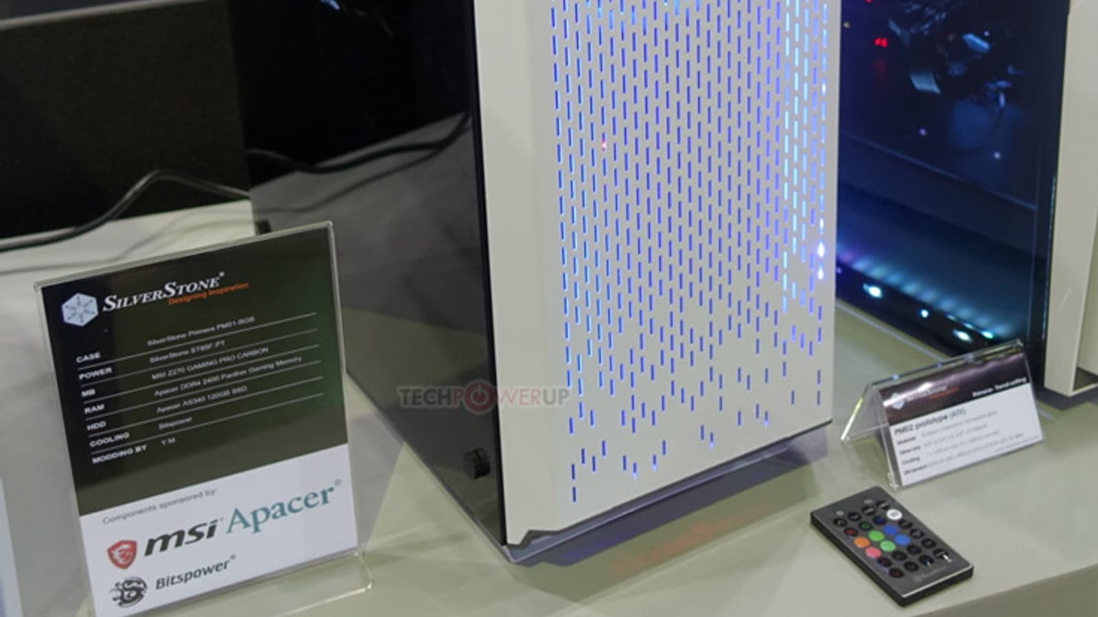 За решеткой просматривается вентилятор типоразмера 140 мм. Всего в корпусе можно установить пять таких вентиляторов. Мест для накопителей типоразмера 3,5 дюйма — три, столько же — для накопителей типоразмера 2,5 дюйма. Корпус размерами 220 x 490 x 473 мм украшен стеклянной боковой панелью и полноцветной светодиодной подсветкой. Управлять подсветкой, питанием системы и скоростью вращения вентиляторов позволяет пульт ДУ, работающий по инфракрасному каналу.