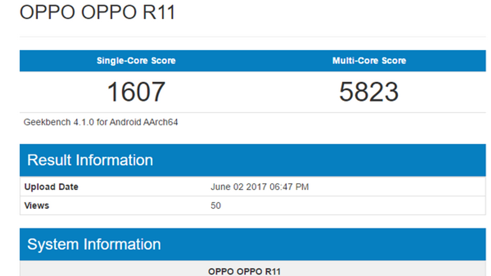 В базе данных тестового пакета GeekBench появился смартфон Oppo R11, оснащенный мобильной платформой Snapdragon 660 и 4 ГБ оперативной памяти.