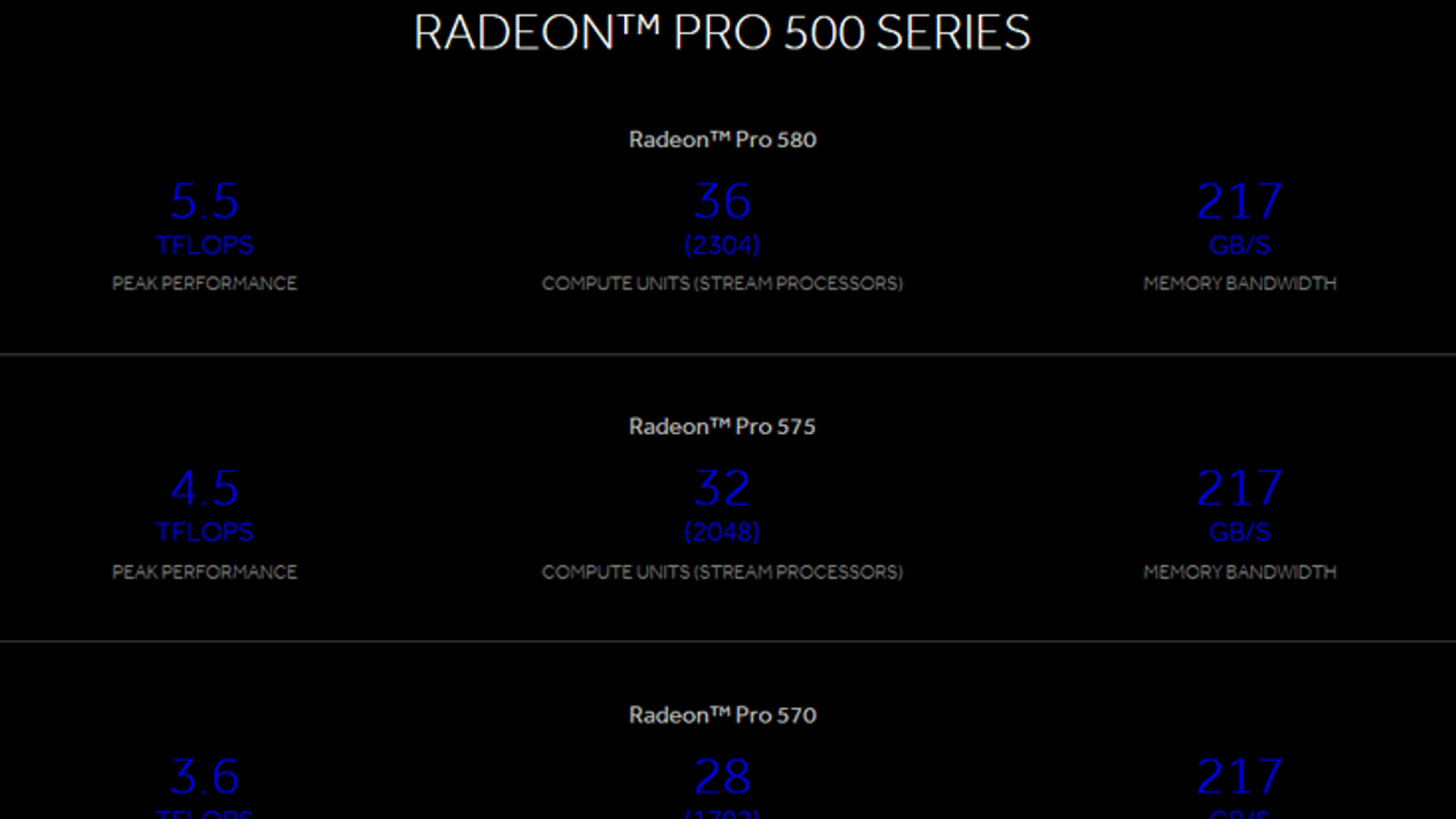Серия 3D-карт AMD Radeon Pro 500 включает пять моделей производительностью до 5,5 TFLOPS. В них используется архитектура GPU Polaris.