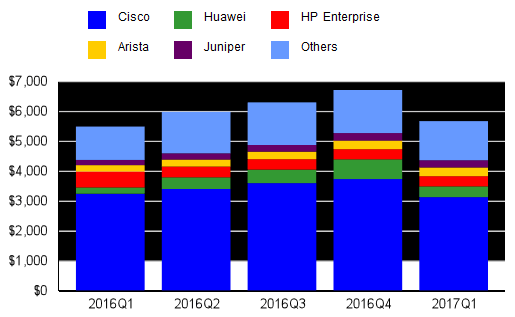 Специалисты IDC подвели итоги первого квартала 2017 года на рынке коммутаторов и маршрутизаторов Ethernet (Layer 2/3). Согласно их подсчетам, за год продажи коммутаторов Ethernet увеличились на 3,3%, составив в первом квартале 5,66 млрд долларов. Продажи маршрутизаторов за год уменьшились на 3,7%, до 3,35 млрд долларов.