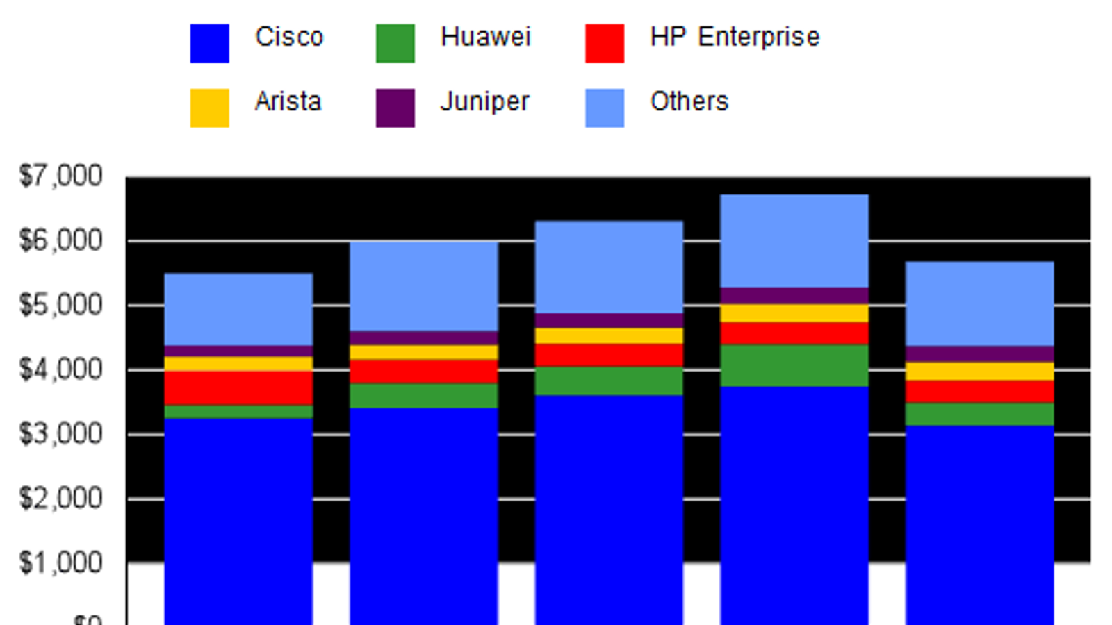 Крупнейшим поставщиком коммутаторов Ethernet, занимающим 55,1% рынка, является компания Cisco. Правда, год назад ее доля была равна 59,0%. Второе место занимает Huawei с 6,3%. В первую пятерку также входят компании HPE, Arista и Juniper, доли которых равны 6,0%, 5,1% и 4,3% соответственно.