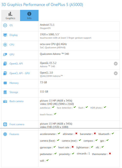 Подробности о смартфоне OnePlus 5 продолжают активно появляться в Сети. В этот раз устройство засветилось в базе данных тестового пакета GFXBench, который подтвердил ранее известные характеристики и сообщил новые.
