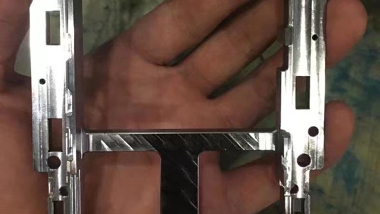Источник опубликовал несколько фотографий, на которых, как утверждается, изображена металлическая рамка шасси смартфона Apple iPhone 8. Впрочем, судя по виду, это в лучшем случае заготовка, а то и вовсе элемент оснастки оборудования.