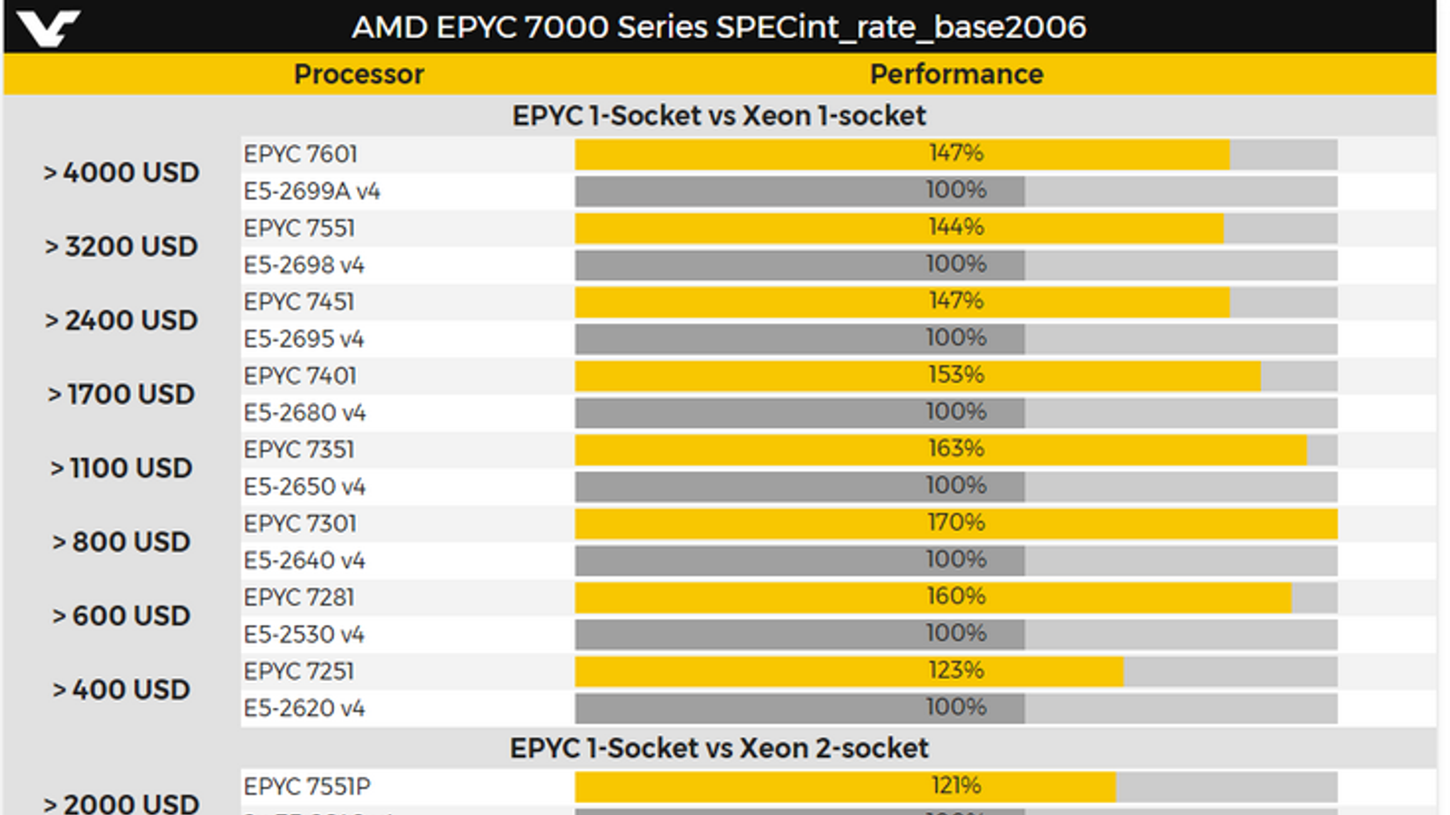 Источник утверждает, что самая доступная модель AMD Epyc обойдётся примерно в 400 долларов, тогда как флагман будет стоит около 4000 долларов. Диаграммы ниже дают понять, какой прирост в сравнении с конкурентами можно получить, выбрав решения AMD.