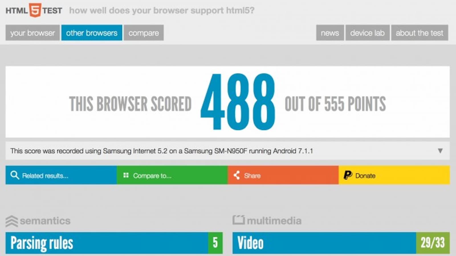 Именно с такой операционной системой тестируется прототип Samsung Galaxy Note 8, который проходит под модельным номером Samsung SM-N950F. В базе данных HTML5Test указано, что смартфон прошел тест в браузере Samsung Internet 5.2, набрав 488 баллов из 555 возможных.