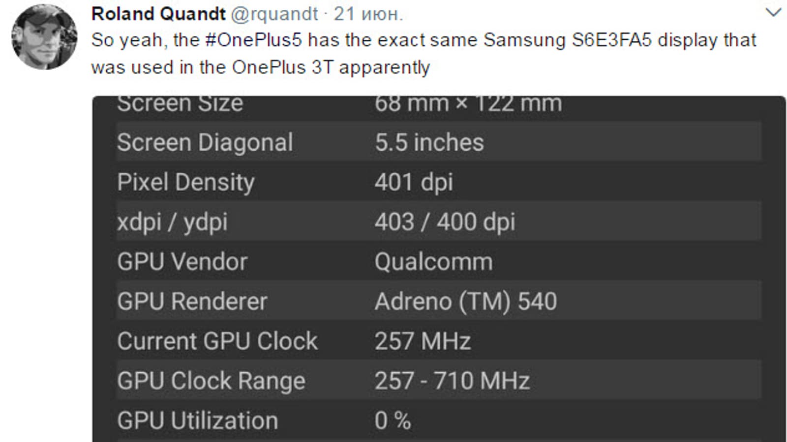 Известный инсайдер Роланд Куандт (Roland Quandt) на своей страничке в Twitter опубликовал подвтерждение того, что в новом смартфоне OnePlus 5 используется тот же дисплей, что и в прошлогоднем флагмане OnePlus 3T.