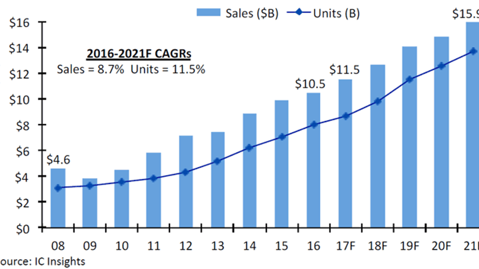 Специалисты аналитической компании IC Insights уверены, что рынок датчиков изображения типа CMOS в ближайшие годы продолжит быстро расти. Ожидается, что в этом году рост составит 9%, а абсолютный показатель станет рекордно высоким седьмой год подряд, достигнув 11,5 млрд долларов.