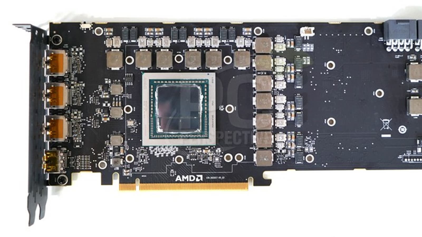 На первый взгляд она не очень сильно отличается от привычных вариантов, но тут стоит вспомнить, что микросхемы памяти расположены на одной подложке с GPU и компоненты, которые расположены сверху и справа от ядра, это вовсе не микросхемы памяти, а катушки индуктивности.