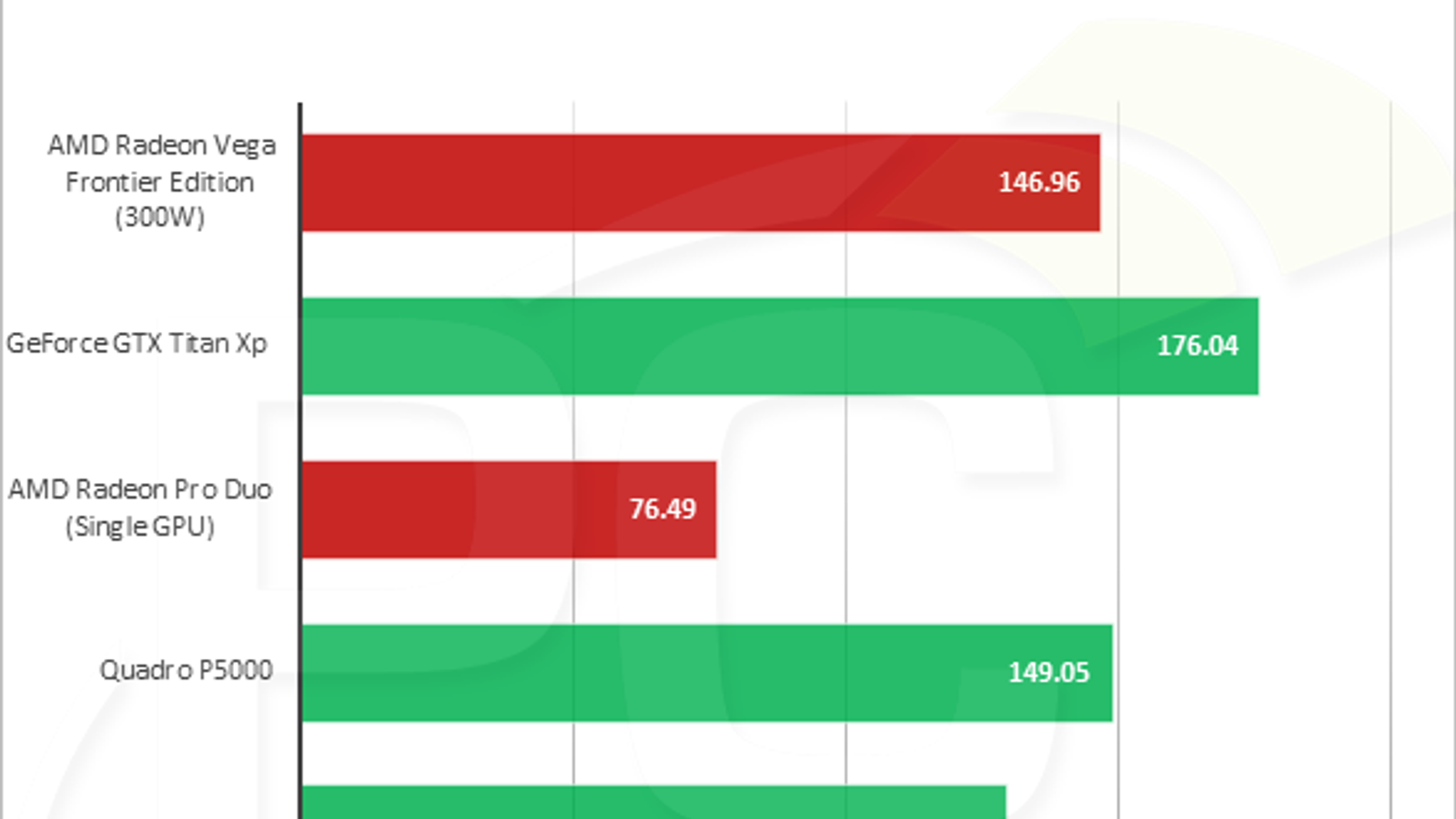 Как видим, результаты получились неравномерные, но кое-что выделить можно. Итак, своего прямого конкурента Radeon Vega Frontier Edition обходит практически всегда, хотя в двух тестах уступает, а в двух у карт почти паритет. Что касается соперничества с более дорогой Quadro P5000, тут ситуация такова: в четырёх тестах из десяти карта AMD оказывается быстрее, и порой существенно, в двух наблюдается паритет и в четырёх ускоритель Nvidia одерживает победу.