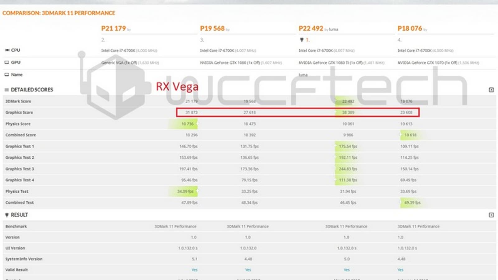 Итак, в тесте 3DMark 11 Performance адаптер AMD набирает 31 873 балла (Graphic Score). Для сравнения, GeForce GTX 1080 в этом же тесте набирает лишь 27 618 баллов, но GTX 1080 Ti всё равно впереди с результатом 38 389 баллов.