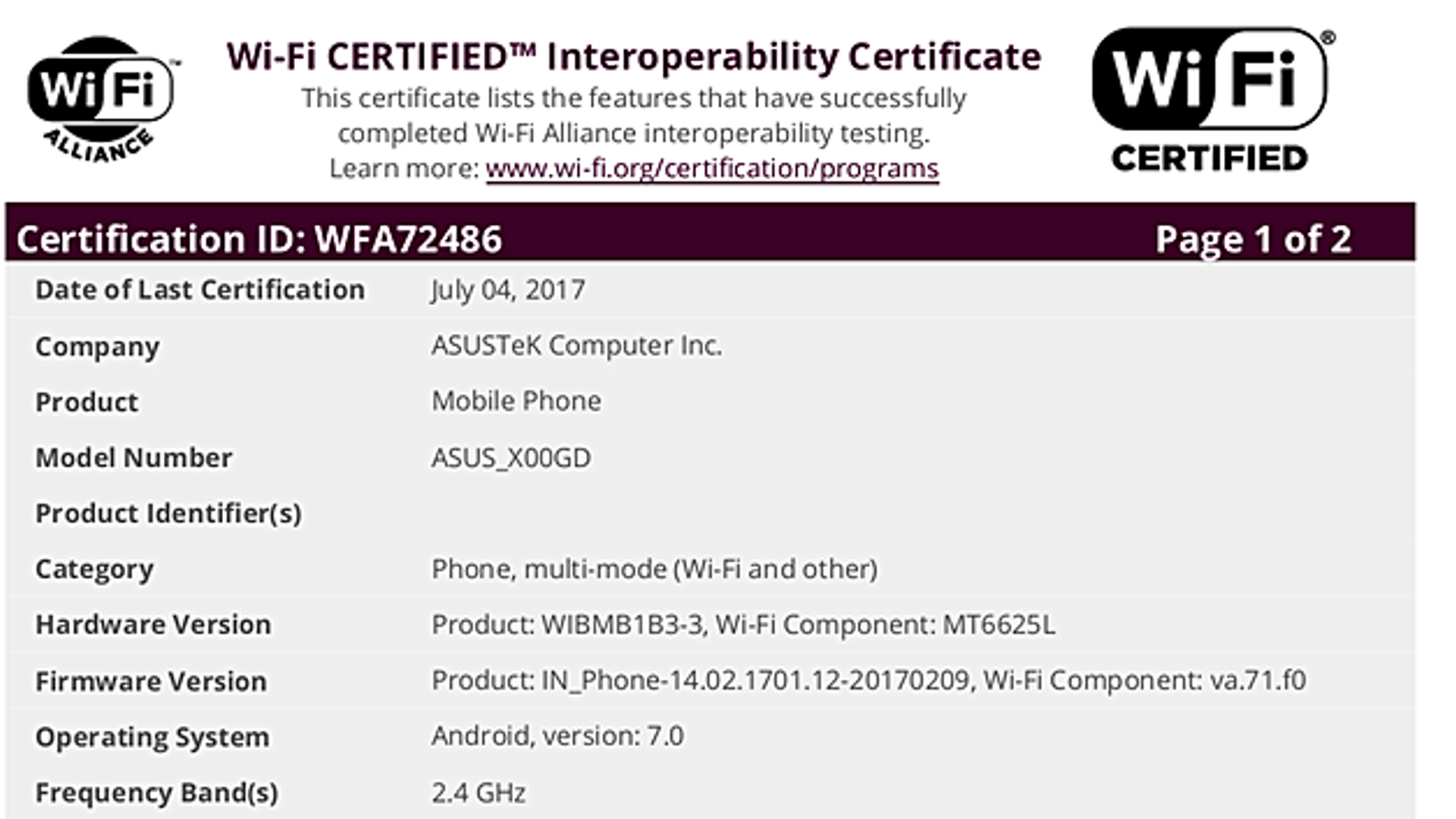 Смартфон Asus X00GD прошел сертификацию в организации WiFi Alliance (WFA). Ранее это устройство было замечено в базе данных TENAA.