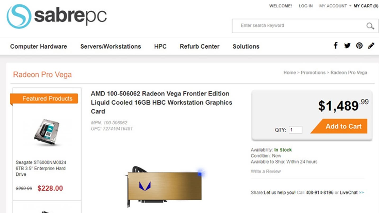 В одном из онлайновых магазинов появилась 3D-карта AMD Radeon Vega Frontier Edition с жидкостной системой охлаждения. Новинка продается за $1490. Она имеет такую же конфигурацию, как вариант с воздушным охлаждением: 4096 потоковых процессоров и 16 ГБ памяти HBM2.