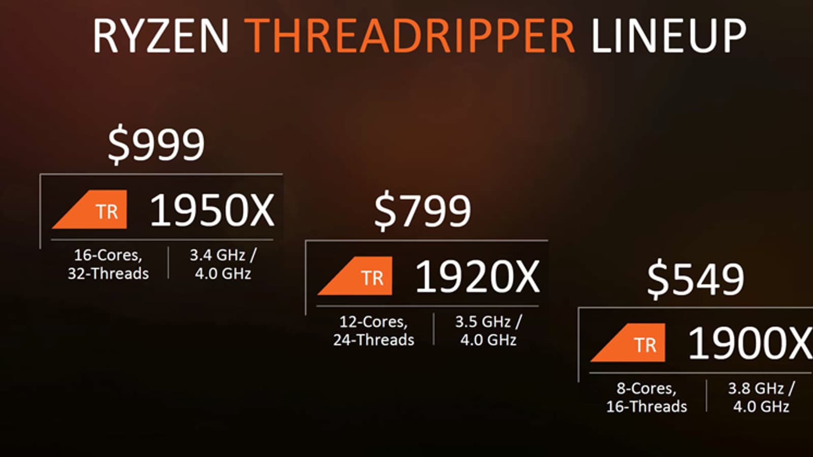Процессор AMD Ryzen Threadripper 1950X располагает 16 ядрами, способными выполнять 32 потока команд, и работает на базовой частоте 3,4 ГГц. Базовая частота 12-ядерной модели 1920X, способной выполнять 24 потока команд, равна 3,5 ГГц, а 8-ядерной модели 1900X, способной выполнять 16 потоков команд, — 3,8 ГГц. Во всех случаях повышенная частота равна 4,0 ГГц, повышенная частота XFR — 4,2 ГГц.