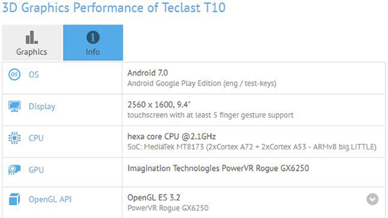Teclast T10, как и многие аналоги, построен на однокристальной платформе MediaTek MT8173, имеющей в своем составе по паре ядер ARM Cortex-A53 и Cortex-A72, а также GPU Imagination PowerVR GX6250. Объемы оперативной памяти составляют 4 и 64 ГБ, разрешение дисплея — 2560 х 1600 пикселей, что при диагонали 9,4 дюйма дает плотность пикселей 321 на дюйм.