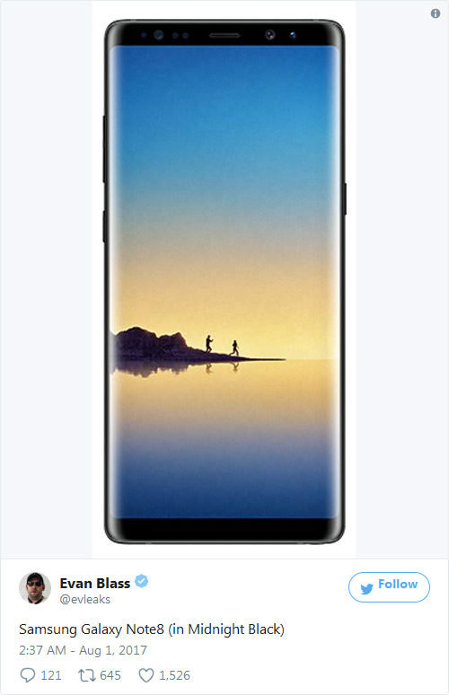 Известный поставщик сведений о грядущих мобильных новинках @evleaks опубликовал изображение Galaxy Note8.