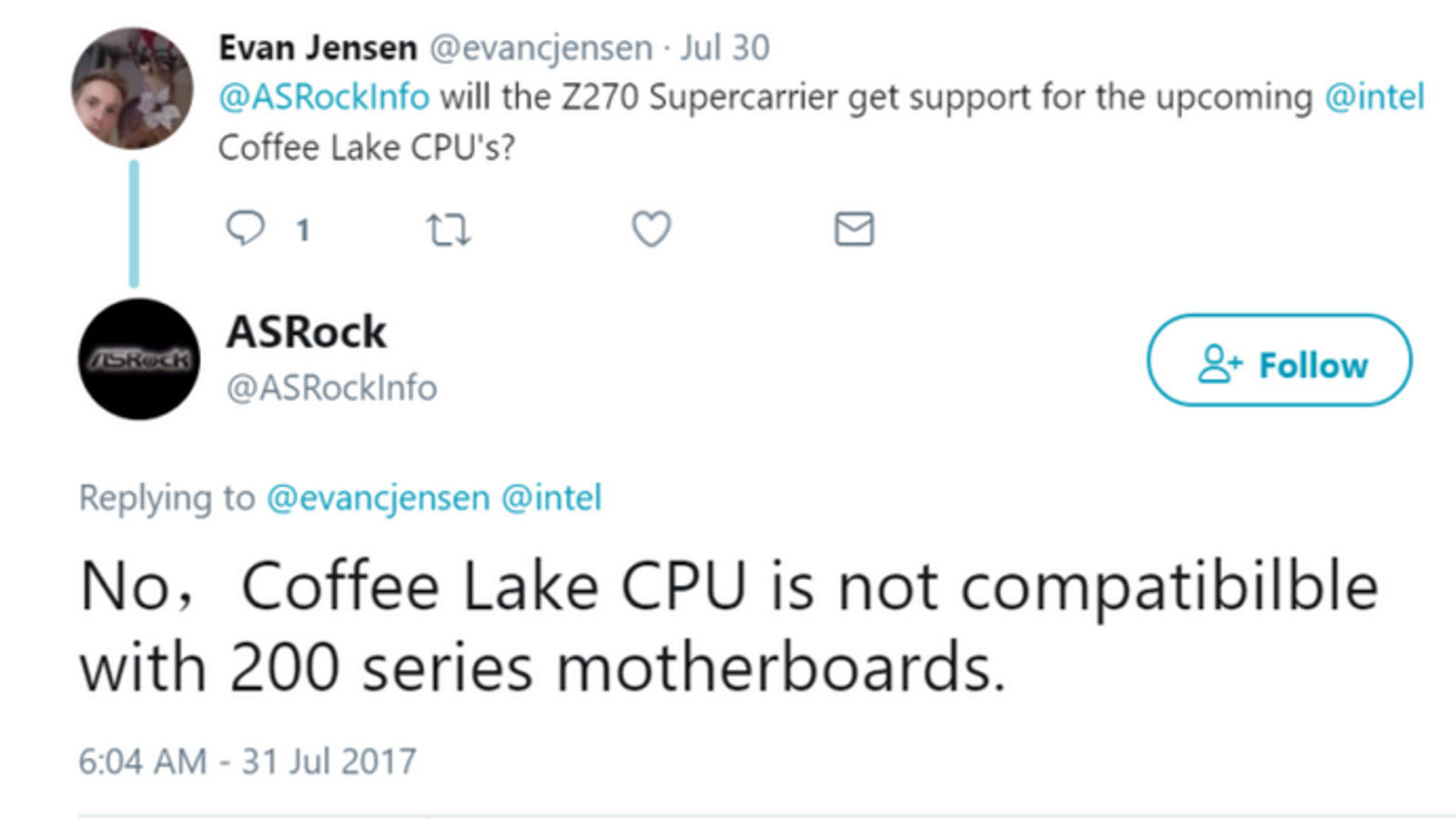Но зато Coffee Lake должны принести в настольный потребительский сегмент шестиядерные модели Core i7 и даже Core i5. Однако есть и ложка дёгтя. Если верить ASRock, новые CPU нельзя будет использовать с системными платами, основанными на наборах логики Intel 200.