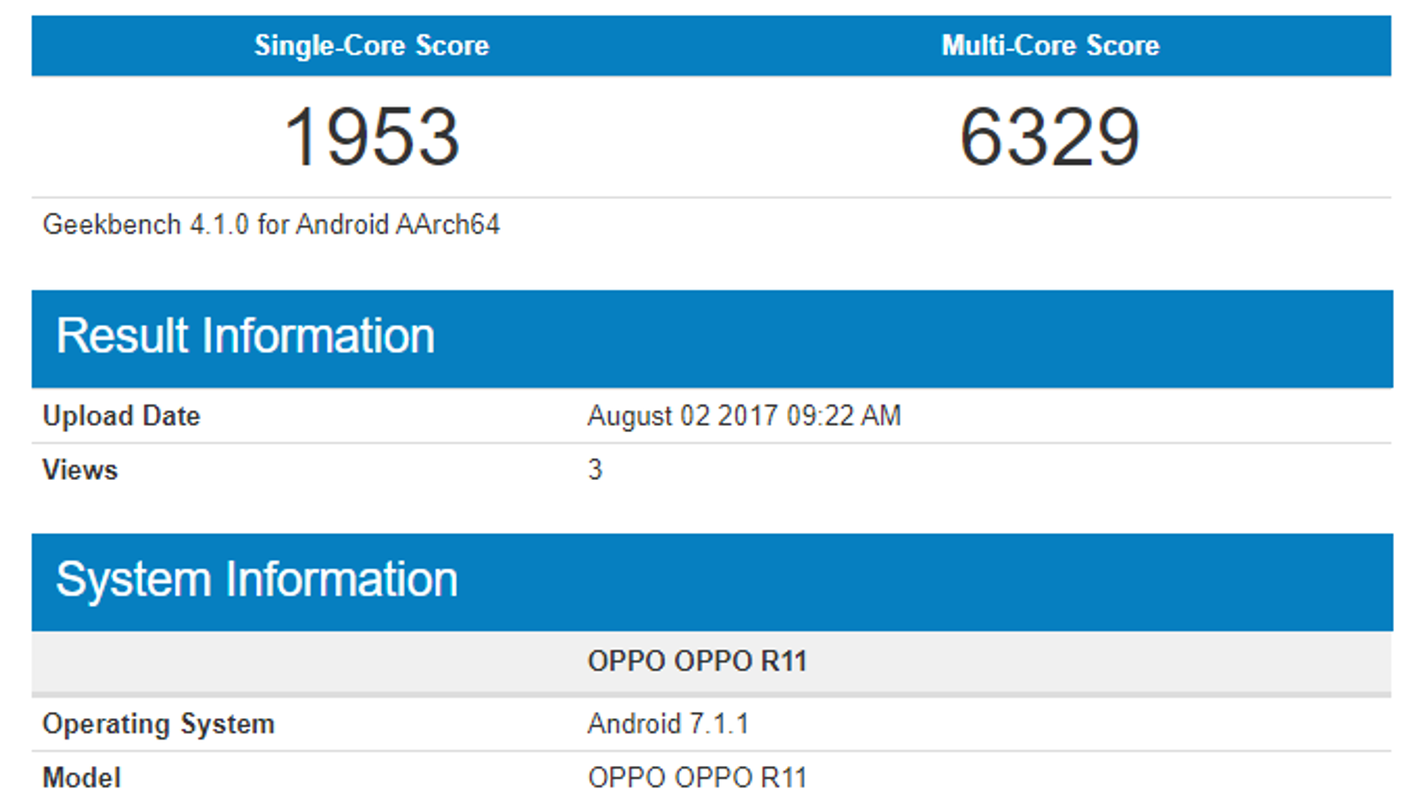 Однако теперь в базе данных Geekbench появился смартфон Oppo R11, который оснащен флагманской однокристальной системой Snapdragon 835, а также 6 ГБ оперативной памяти.