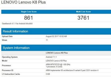 Смартфон Lenovo K8 Plus получит 16-нанометровую платформу MediaTek
