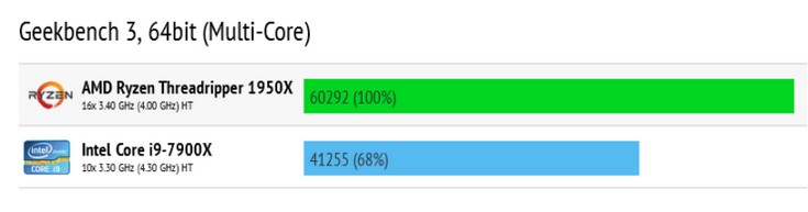 На диаграммах можно видеть, что Ryzen Threadripper 1950X оказывается почти в полтора раза производительнее прямого конкурента. Конечно, на стороне процессора AMD намного большее количество ядер, но какая разница конечному потребителю, каким образом один продукт опережает другой при идентичной стоимости?