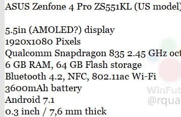 Смартфон Asus Zenfone 4 Pro получит аккумулятор емкостью 3600 мА•ч