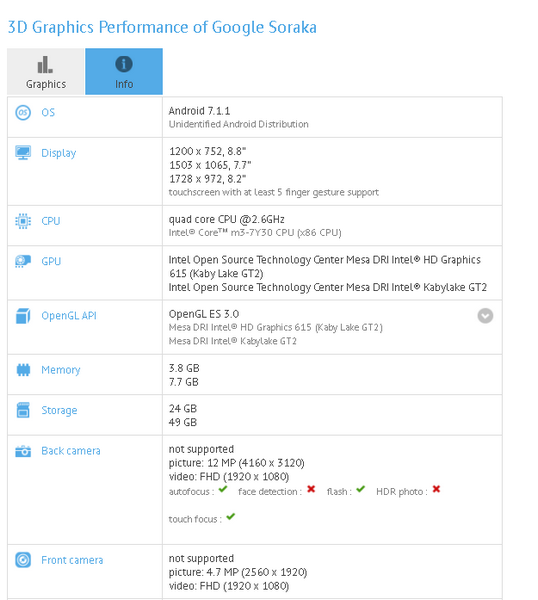В основе устройства лежит CPU Intel Core m3-7Y30 поколения Kaby Lake. Также ПО говорит о камерах разрешением 13 и 5 Мп. Остальные параметры указывают на то, что тесты проходили несколько модификаций.