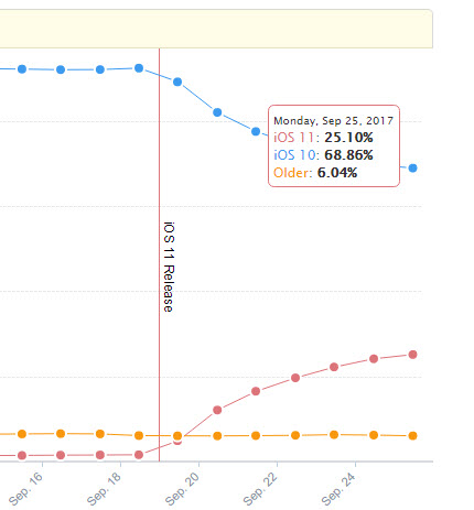 По состоянию на 25 сентября (6 дней после выхода) доля iOS 11 превысила 25%, как показано на следующем графике. iOS 10 установлена на 68,86% совместимых устройств. Остальным версиям iOS досталось около 6%.